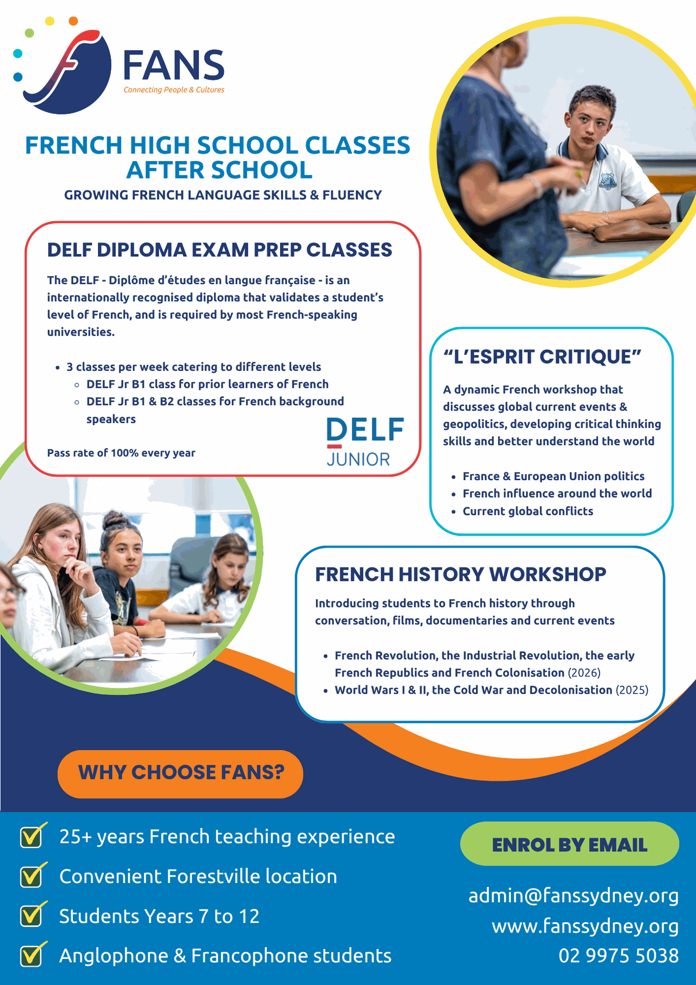 Information about the association, the bilingual program, and high school classes can be found on our website: www.fanssydney.org